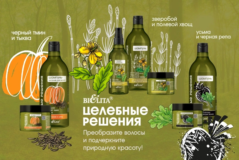 Компания БЕЛИТА разработала новую линию средств по уходу за волосами Целебные решения, предназначенную для восстановления, роста и усиления естественной красоты ваших волос. Целебные продукты содержат силу натуральных ингредиентов, которые вернут жизнь вашим волосам. Благодаря активным компонентам каждый продукт является свидетельством красоты природы.